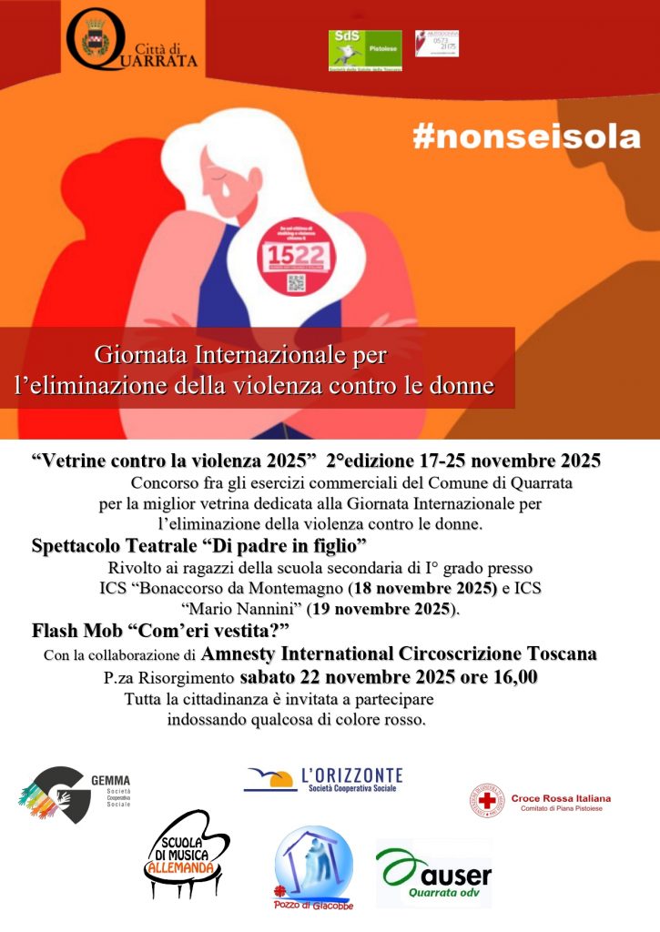In occasione della “Giornata Internazionale per l’eliminazione della violenza contro le donne”, che ricorre il 25 novembre, il nostro Comitato ha aderito al progetto promosso dal Comune di Quarrata con associazioni e cooperative del territorio, dal titolo #nonseisola”.