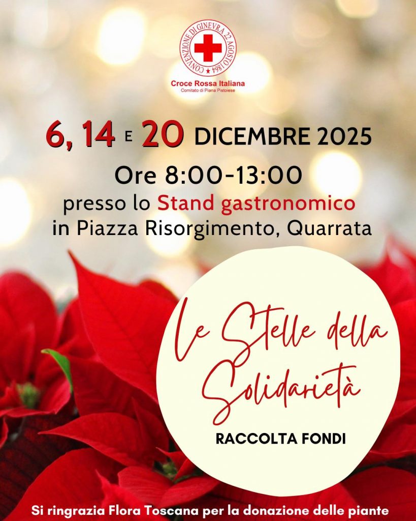 Nei giorni 6, 14 e 20 dicembre 2025 dalle 8:00 alle 13:00, potrai trovare le nostre stelle solidali presso lo stand gastronomico in Piazza Risorgimento a Quarrata. Venite a trovarci per sostenere le attivitร della Croce Rossa e portare a casa una stella di Natale solidale.